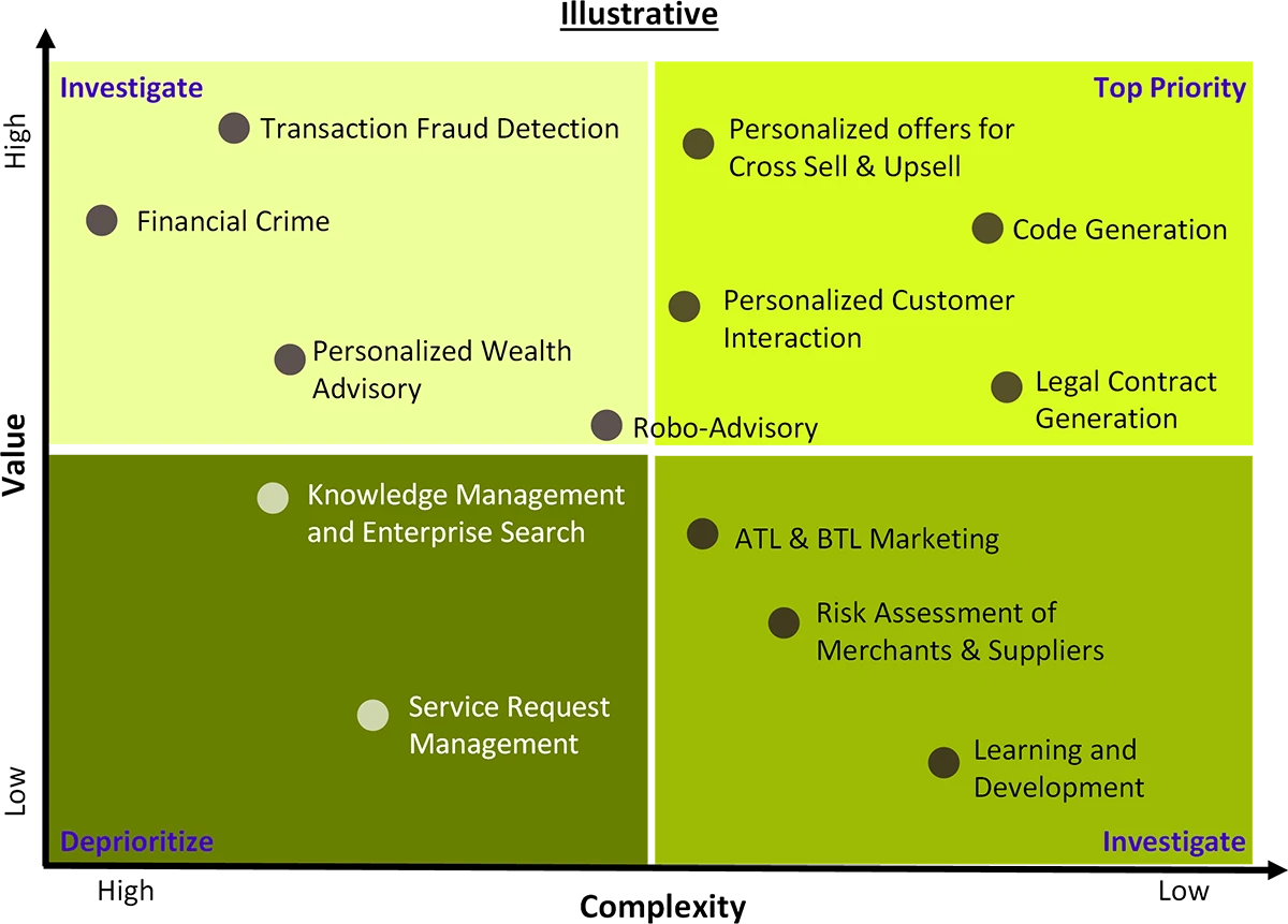 - Value Viability: Is the AI solution aligned with company’s strategic priorities? Will the AI solution improve customer experience by improving engagement, information access, etc.? (Revenue Uplift, Cost Optimization, Risk Reduction, Customer Engagement/ Satisfaction)