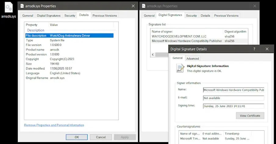 The exploited driver, “amsdk.sys” (v1.0.600), is a Microsoft-signed, 64-bit Windows kernel driver built on the Zemana Anti-Malware SDK. Check Point noted, “This driver, built on the Zemana Anti-Malware SDK, was Microsoft-signed, not listed in the Microsoft Vulnerable Driver Blocklist, and not detected by community projects like LOLDrivers.”