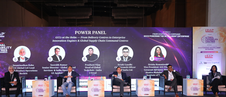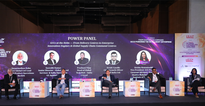 The panel featured Swaminathan Babu, GCC Global CoE Lead – FP&A Product Operations at Reckitt; Saurabh Kumar, Senior Director – Global Shared Services & India Operations at GE Appliances; a senior leader from L’Oréal; and Hrishi Gandhi of LEAP India. The speakers discussed the transition from service-based delivery models toward outcome-driven enterprise mandates, with GCCs increasingly owning global platforms, intellectual property, and strategic innovation initiatives.